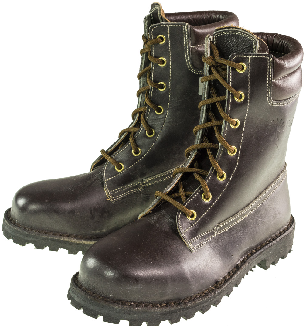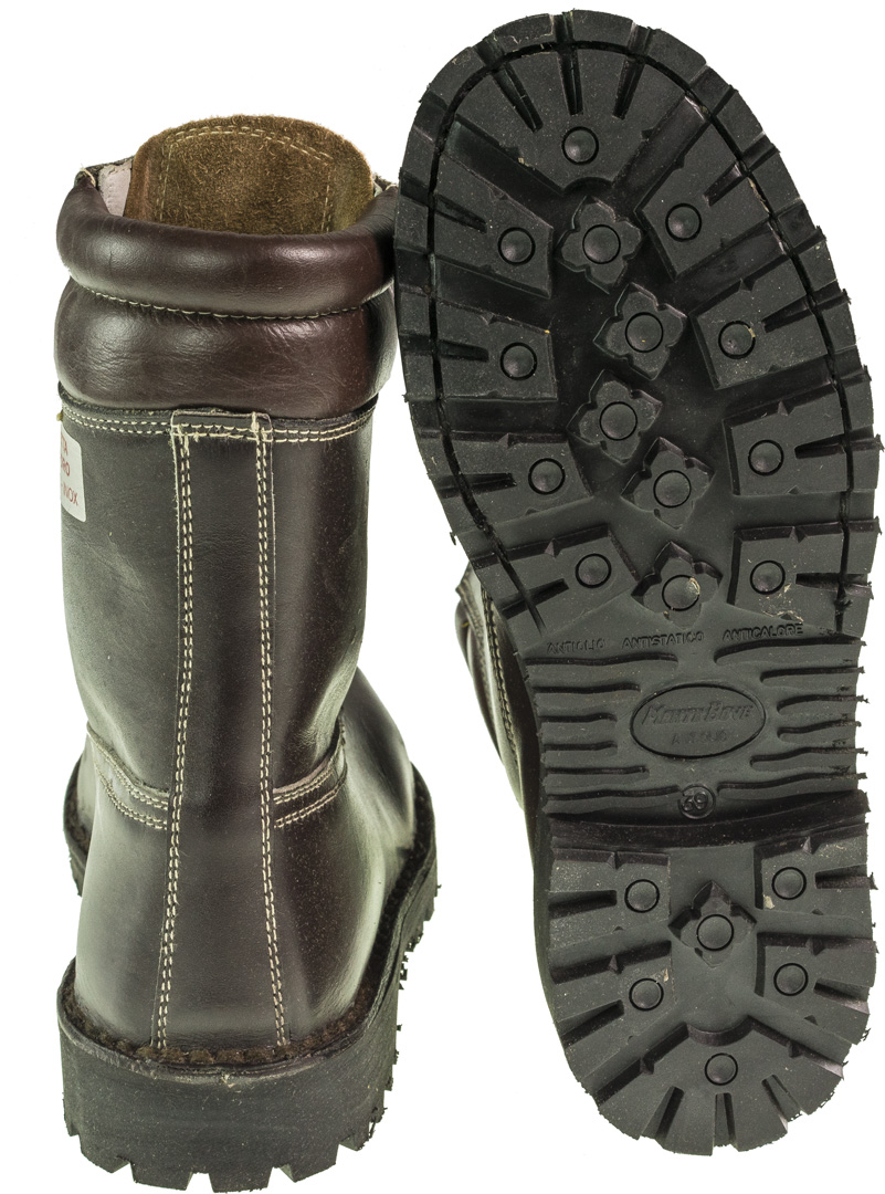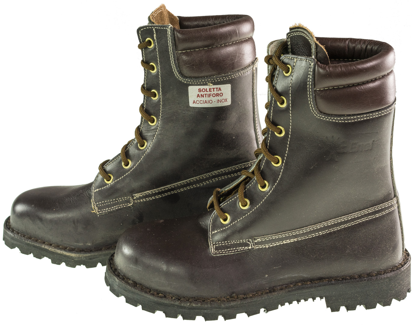 Nuovi N.B (privi di certificazioni ) Colore marrone scuro Modello antiinfortunistico Impermiabili Puntale in acciaio Interamente prodotti in Italia Cuciture alla norvegese In pelle pieno fiore Lacci neri in meraklon antimuffa Imbottiti al polpaccio lastrina interna antiperforazione Suola modello roccia Infrasuola in cuoio Suola antiolio antistatica anticalore antiforo Colore marrone scuro Passanti in metallo ottone Altezza circa 27 cm