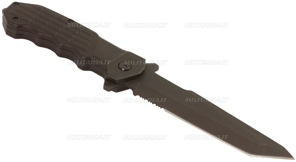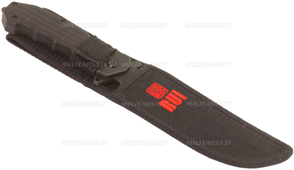 Acciaio inossidabile 440 titanio rivestito su tutta la lama Spuntone metallico sfondavetro sull'impugnatura Fodero in cordura nera Fodero con passante per cintura da 90 mm Lunghezza lama 140 mm Spessore lama 3 mm Lunghezza impugnatura 130 mm Seghettatura parte inferiore di 25 mm Lunghezza totale 270 mm Custodia in cordura a chiusura nastro a strappo Altezza passante fodero 90 mm