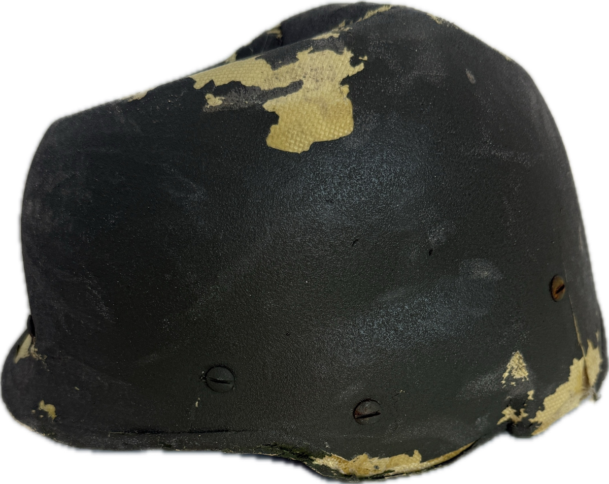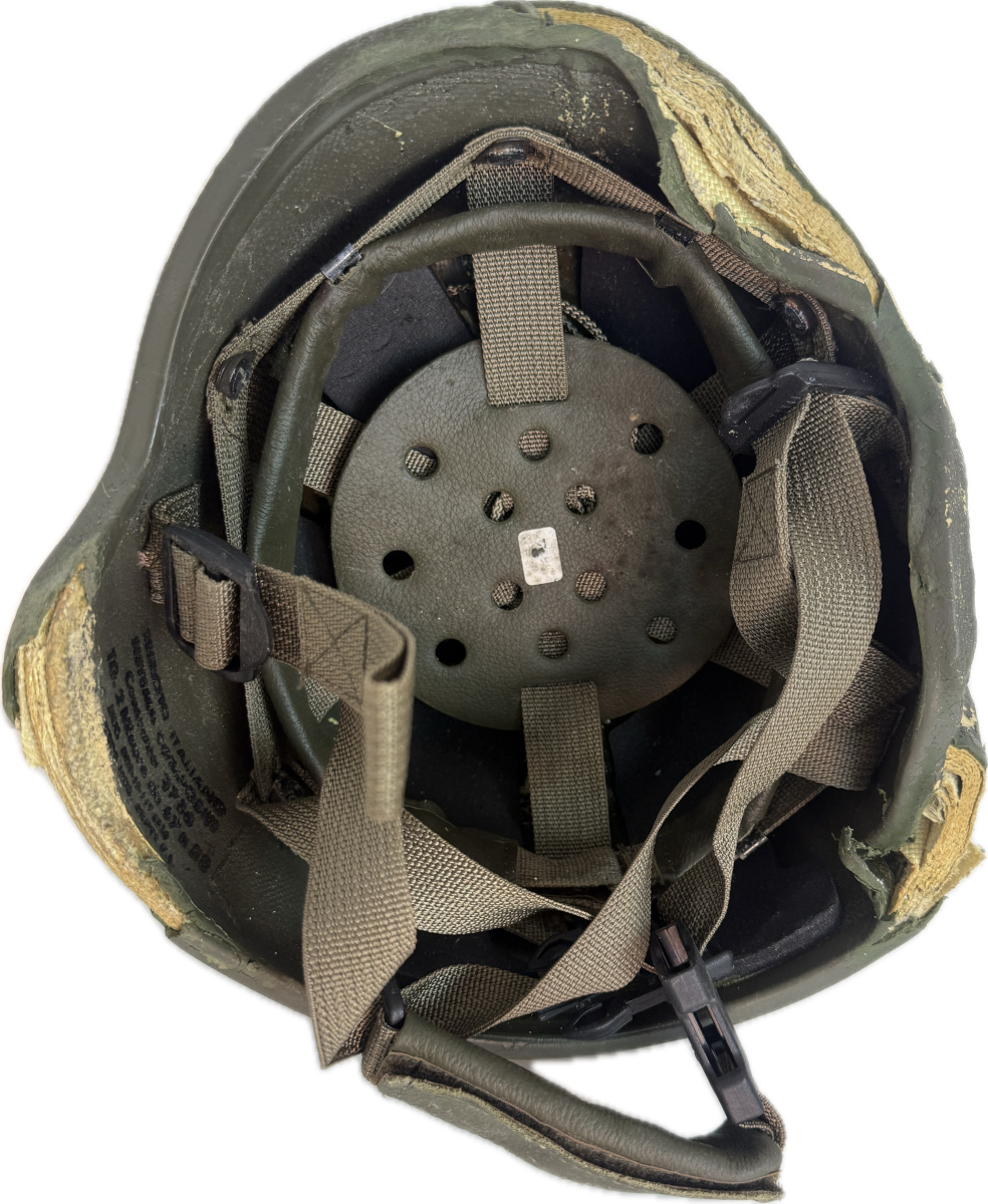 Autentico elmetto in nylon balistico, ex dotazione dell’Esercito Italiano nei primi anni 2000. Proveniente da magazzini militari, è un articolo originale e fortemente usato, venduto esclusivamente a scopo collezionistico, scenografico o decorativo.