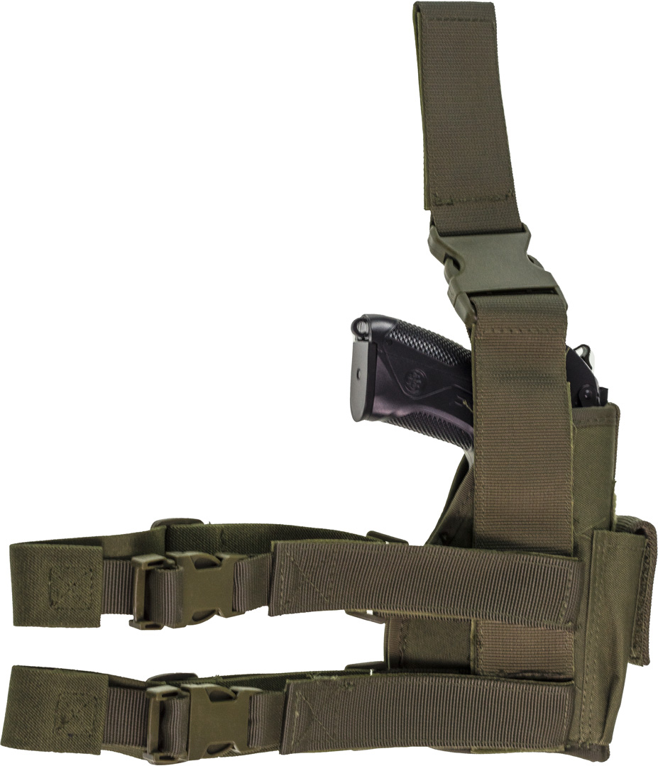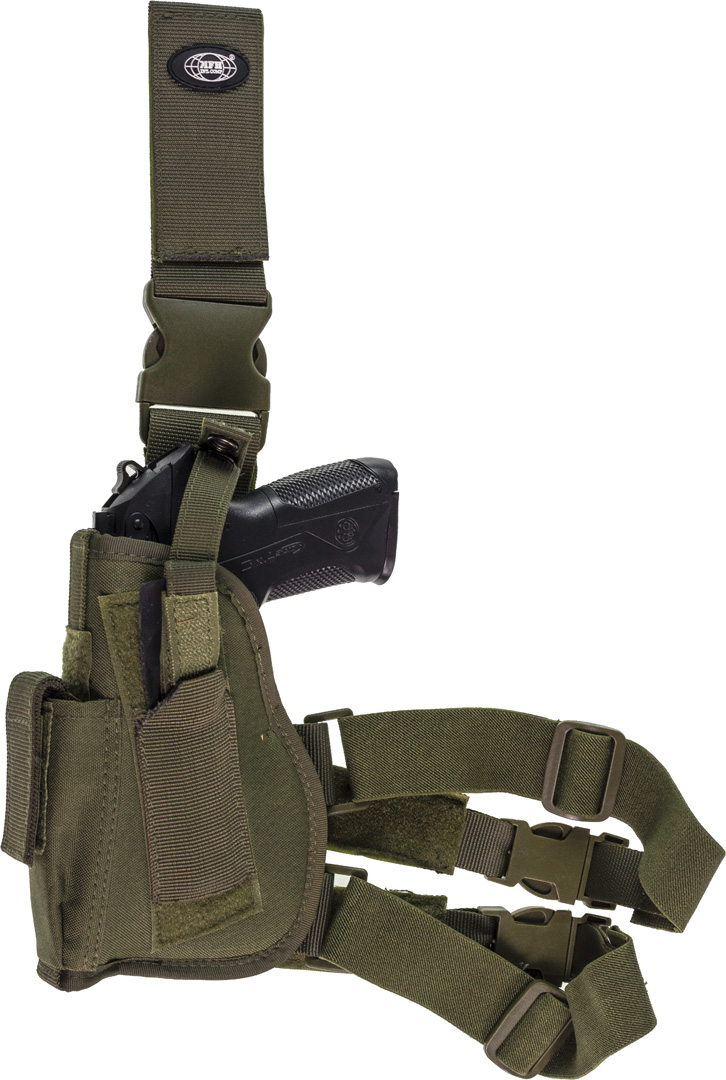 per mancini In cordura Passante a nastro a strappo sganciabile per cintura Doppio attacco cosciale a clip con elastici regolabili Sgancio rapido tramite bottone automatico Regolazione in altezza tramite nastro a strappo Portacaricatore integrato compatibile con tutte le Large auto (Beretta, Taurus,Colt, Sig, Smith wesson, P38, PX4, Glock) Non adatta alla Desert Eagle