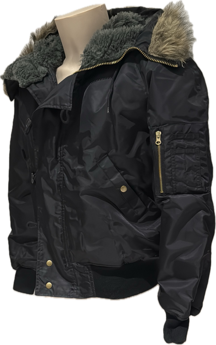 Cappuccio con pelliccia sintetica, separabile con zip per aprirlo sulle spalle 2 tasche laterali con bottone automatico 2 tasche interne Giacca di protezione dal freddo in nylon resistente Tasca applicata sulla parte superiore del braccio con cerniera e ufficio sul braccio Ampia striscia di copertura sopra la cerniera frontale Polsini e orlo in maglia
