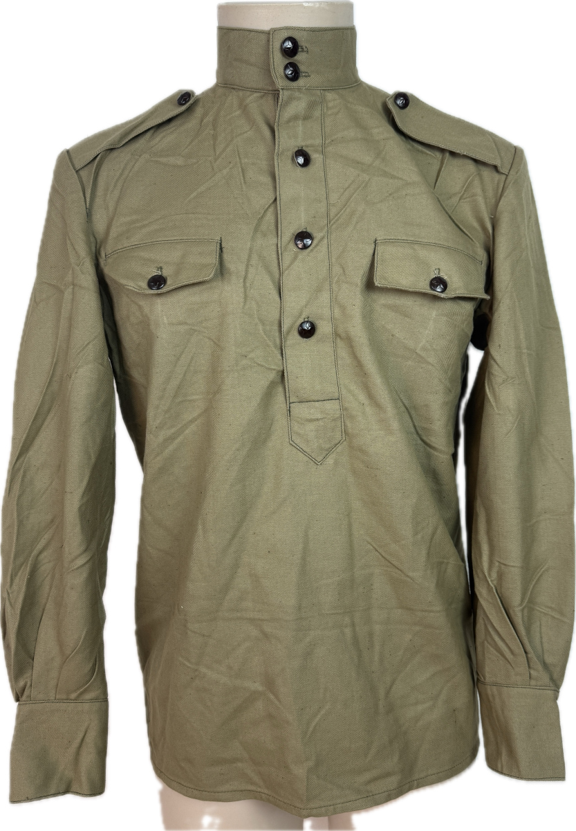 La Gymnastiorka era la tipica casacca da fanteria di derivazione sovietica: semplice, funzionale, infilabile dalla testa, con pochi bottoni e spalline ben evidenti secondo la tradizione russa. Questo modello fu adottato anche da vari Paesi alleati dell’URSS.