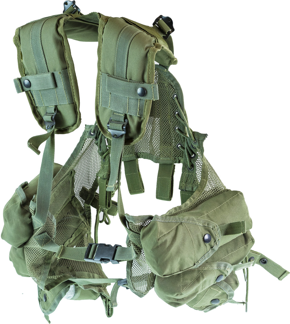 load bearing vest nuovo taglia unica regolabile in altezza e larghezza parte anteriore in rete di cordura traspirante 4 portacaricatori per serie colt e 2 porta-granate in posizione bassa taschine chiudibili tramite nastro a strappo e bottone automatico cinghie anteriori e posteriori lacci laterali elastici. 2 fibbie frontali 6 attacchi per cinturone spallacci imbottiti
