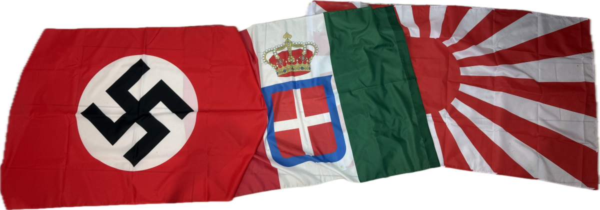 Set di repliche storiche WWII delle bandiere del Patto d’Acciaio (Seconda Guerra Mondiale). Realizzate per uso scenico, teatrale, cinematografico, museale e rievocazioni storiche.