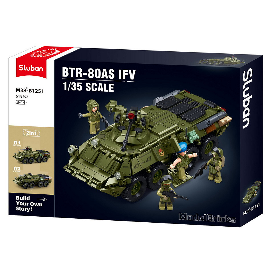 Set di costruzioni militari della linea Sluban Army, ispirato al veicolo corazzato BTR-80AS IFV. I mattoncini Sluban sono compatibili con le principali marche di costruzioni a incastro, consentendo ampia possibilità di combinazione e personalizzazione.